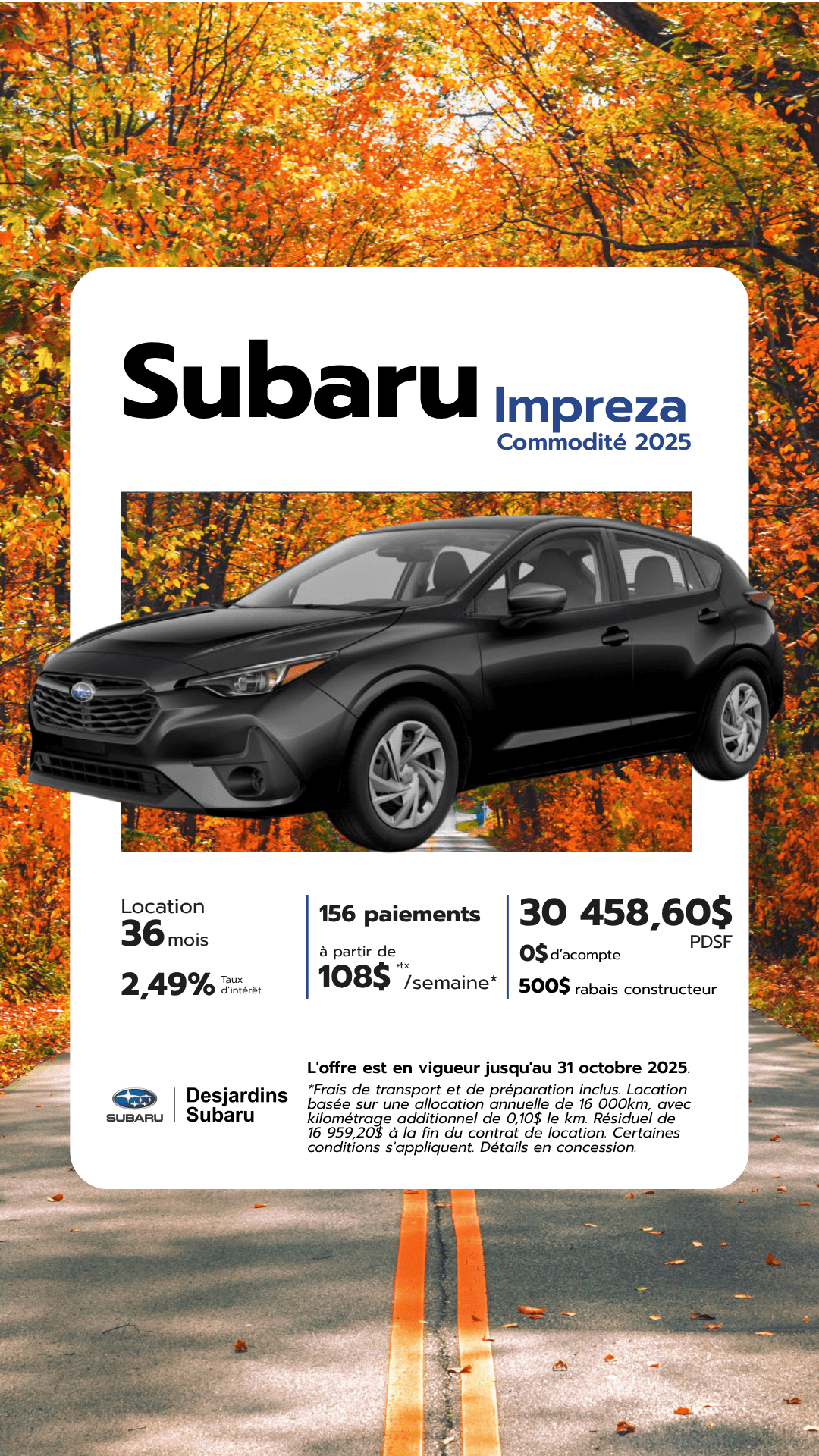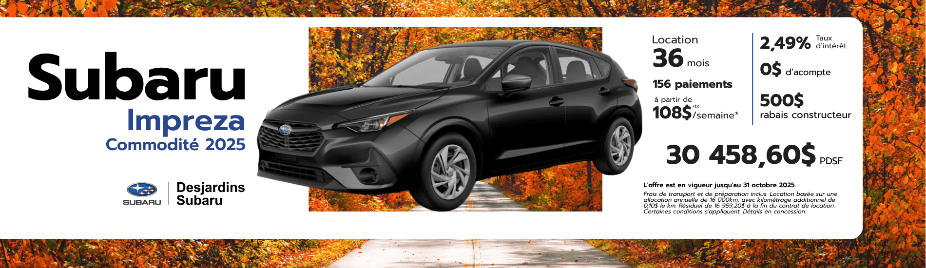 Les amateurs de hatchback seront comblés avec une [Impreza 2025](https://www.desjardinssubaru.com/vehicules-neufs/subaru-impreza-2025/) ou encore une berline sportive avec la [WRX 2025](https://www.desjardinssubaru.com/vehicules-neufs/subaru-wrx/). À moins que vous ne cherchiez la sportivité d’un coupé avec la [BRZ 2025](https://www.desjardinssubaru.com/vehicules-neufs/subaru-brz-2025/#subaru-brz-2025-sporttech-at-svast), une voiture des plus amusantes à conduire.